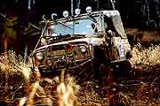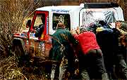 по полтора УАЗ ползет в грязи. Самоходом нельзя, колеса погружаются в жижу,