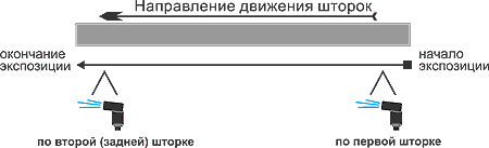 Синхронизация по передней или задней шторке затвора. Синхронизация по передней шторке - cпособ синхронизации когда вспышка срабатывает в самом начале промежутка выдержки. Синхронизация по задней шторке. Способ синхронизации когда вспышка срабатывает в самом конце промежутка выдержки.