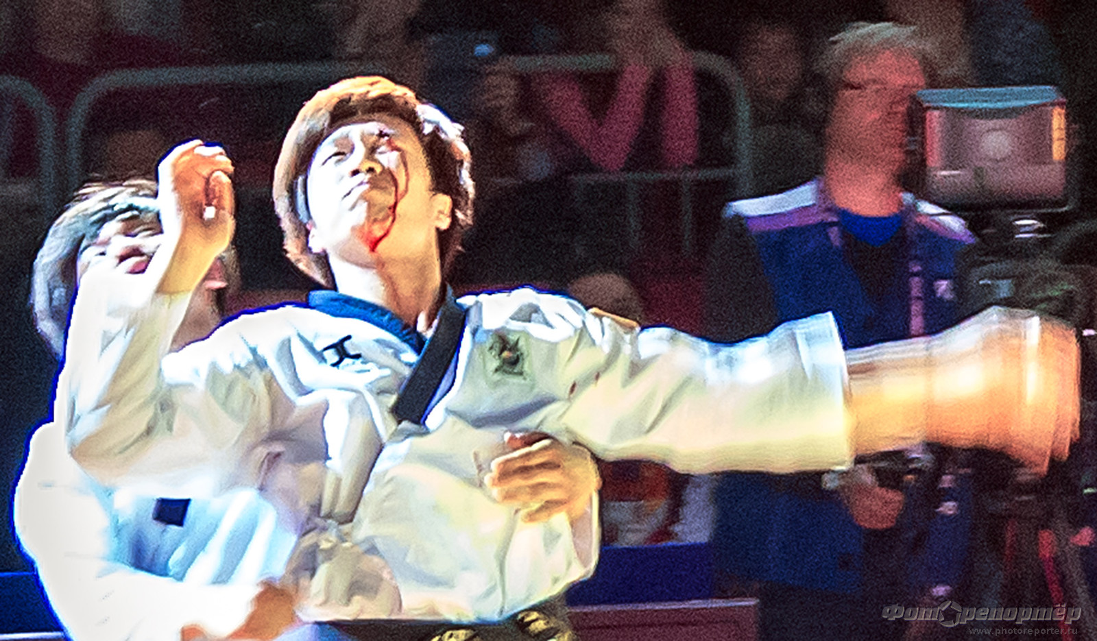 Травму до крови получил один из спортсменов во время показательных выступлений Южной Кореи. Вот так и отработал все номера до конца.