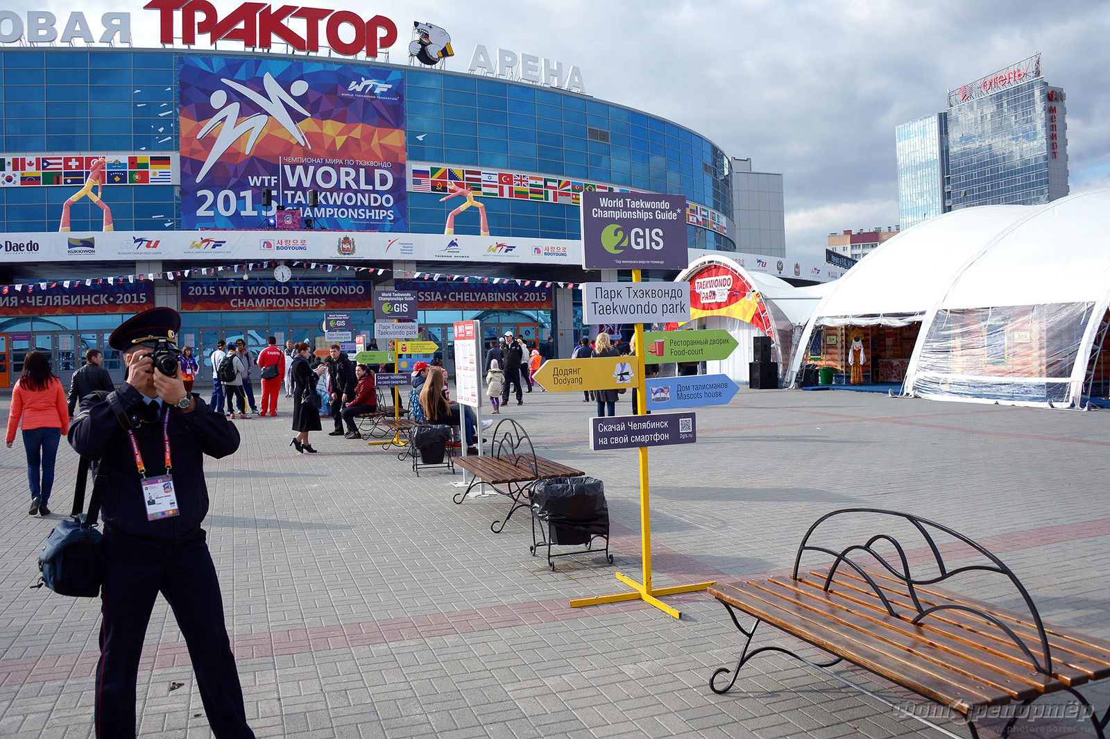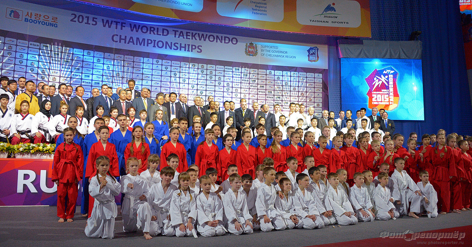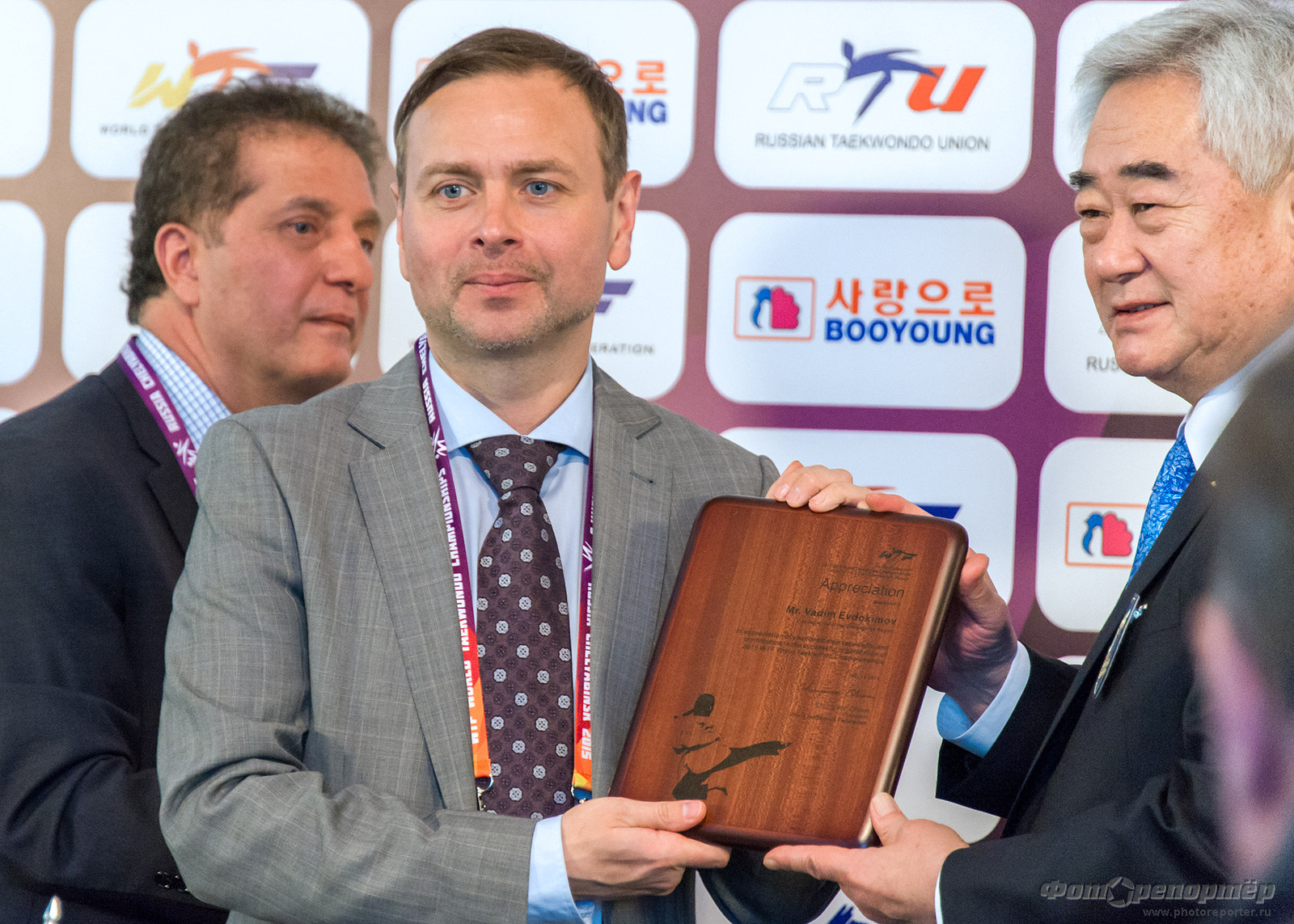 По окончании пресс-конференции президент ВТФ Чунг Вон Чо вручил памятные подарки руководителю Оргкомитета ЧМ-2015 Вадиму Евдокимову.