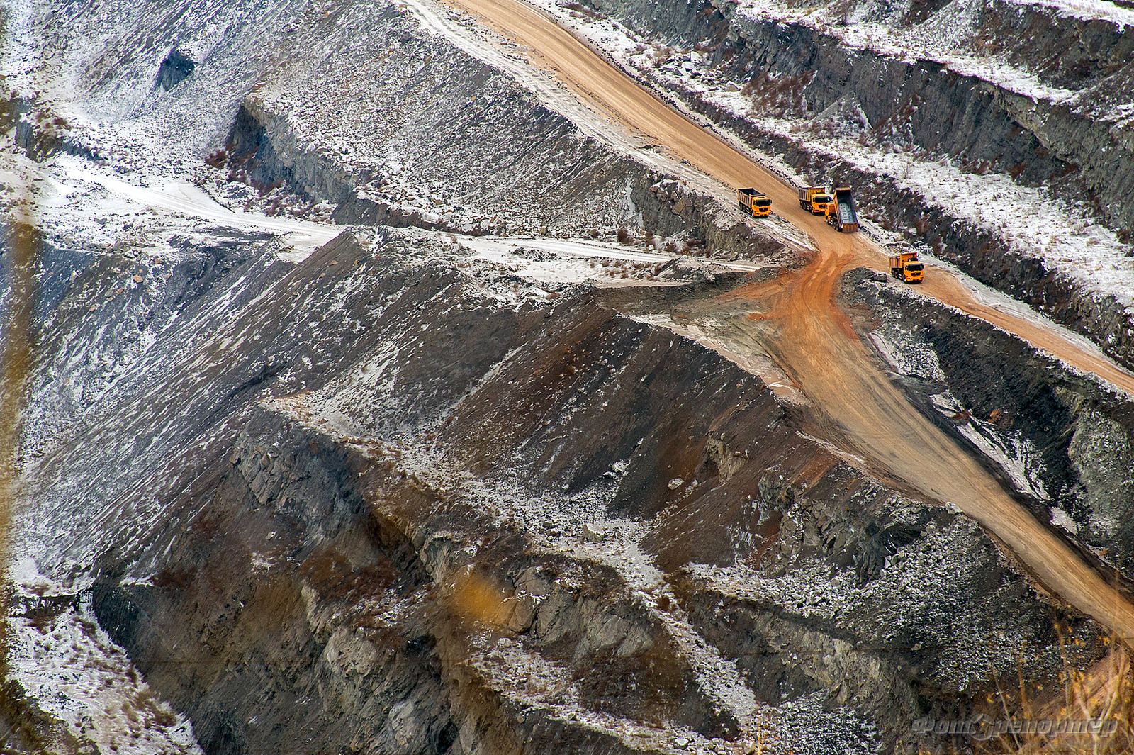Карьеру 82 года – рекордный срок жизни для угольного предприятия. В советские годы, когда разрез достиг приличной глубины, построили электрифицированную железную дорогу, протяжённость которой превышала 100 километров. Сейчас технологический процесс добычи угля в Коркинском разрезе выглядит так: пласты угля взрывают, грузят экскаваторами, отгружают на конвейер, вывозят автотранспортом. Для этого внутри карьера построили автомобильную дорогу.