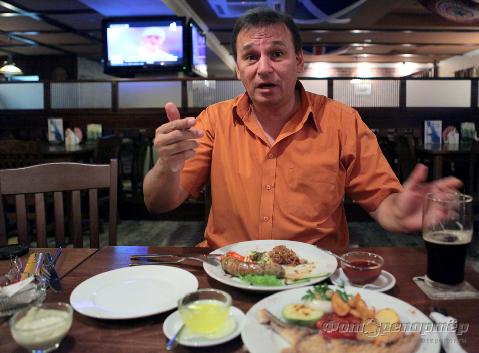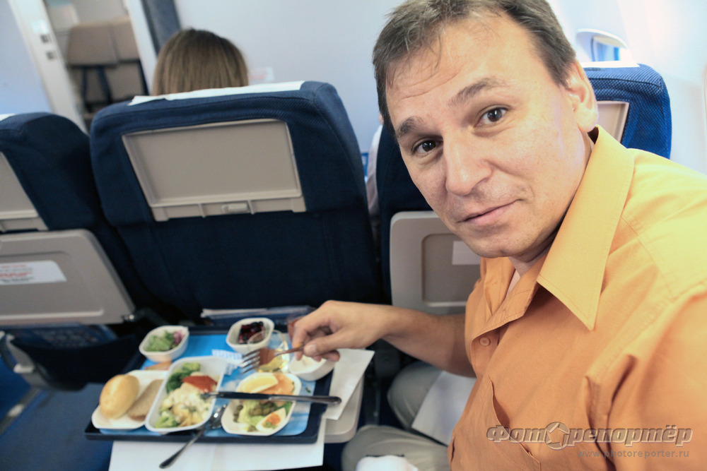 С нами в бизнесс-классе летел батюшка. В его газете заголовок статьи "От жары можно спастись". А мы и спасаемся!
