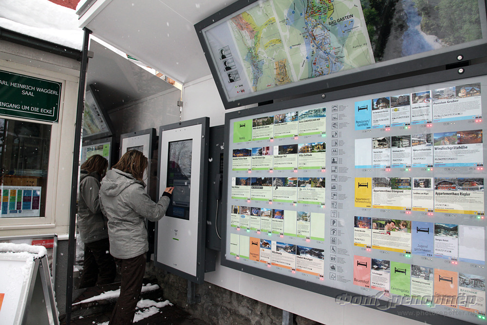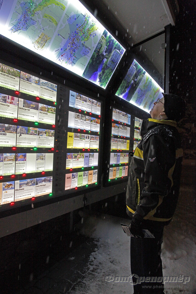 Одна из услуг - индикатор наличия свободных мест в отелях города. Зеленые лампочки указывают, что в этой гостинице есть свободные места. Нажав на кнопку, можно посмотреть по карте, где находится эта гостиница. Сотрудник службы информации может тут же созвониться с гостиницей и узнать подробности. Это бесплатно. Впрочем, вы можете и сами все узнать: рядом расположен телефон, а на стенде есть вся информация о гостинице. Бесплатно вам дадут карту района и города.