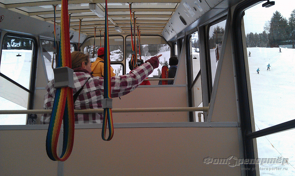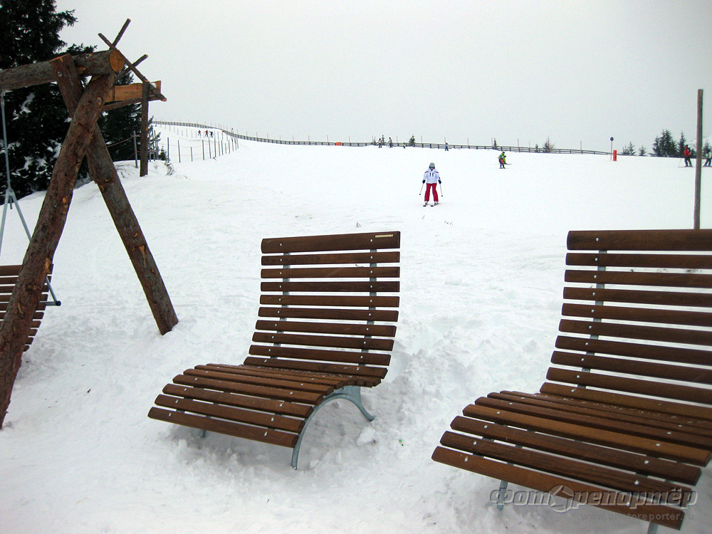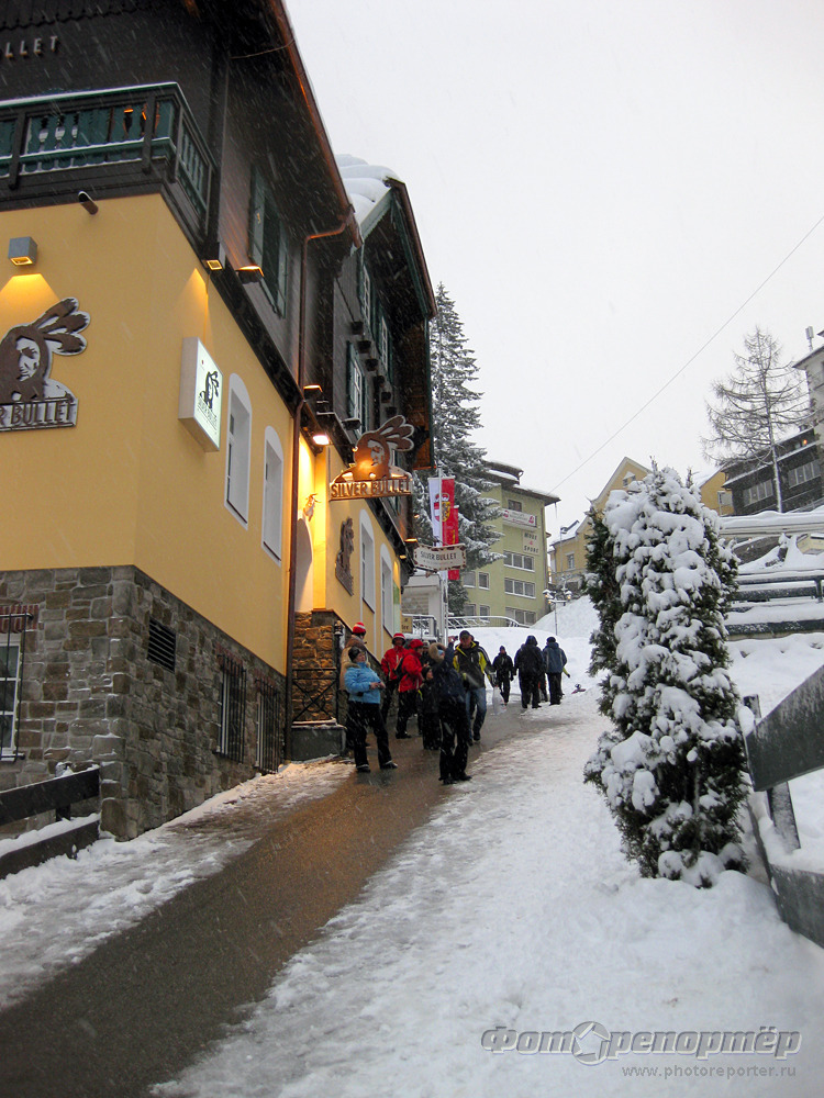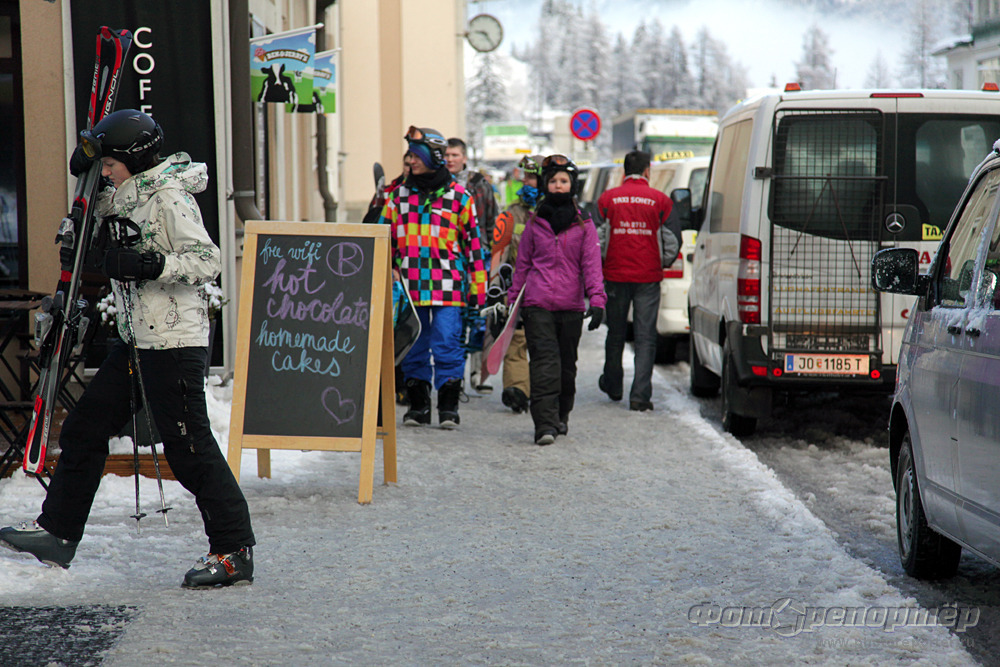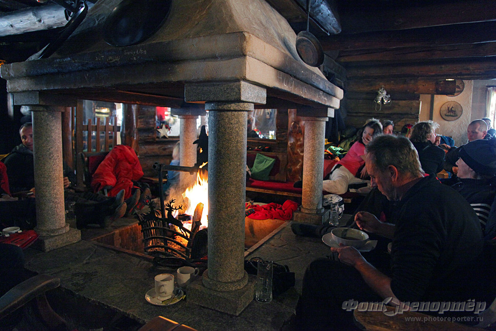 Очень эффектное заведение. Стены и потолок деревянные, некрашеные и почти черные. Как и во всех кафе на склоне, здесь кипит жизнь: постоянно кто-то входит и выходит, топает лыжными ботинками, у стойки сидят несколько человек и бойко переговариваются с барменами, официанты бегают по залу, в центре - очаг и открытый огонь. В меню и традиционный для всех таких заведений глинтвейн, с десяток сортов пива, штук пять супов, мясо, обязательно картошка фри, самая разная выпечка.