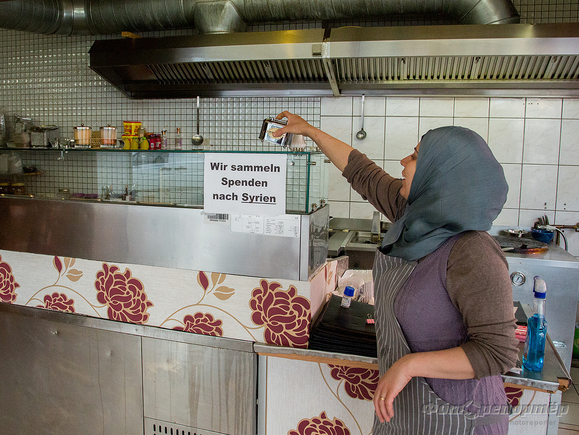 Маленькое семейное кафе. Подают индийскую кухню. На витрине табличка "Мы собираем пожертвования для Сирии".