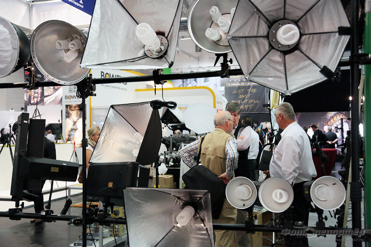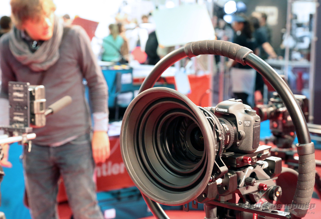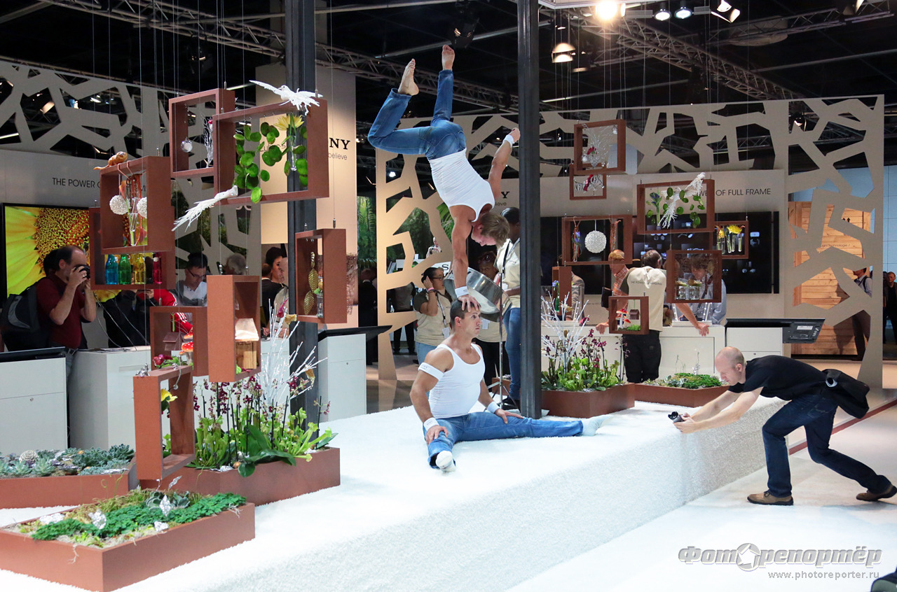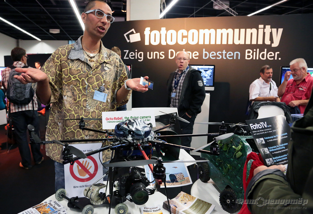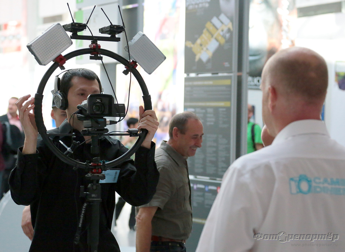 На многих стендах постоянно происходит какая-то движуха. То человек рассказывает о новой фотокамере, на другом демонстрируют роботов для съемок таймлапсов. У больших фирм выставлены и фотоаппараты и объективы - можно попробовать. А где-то - китайский цирк или музыканты.