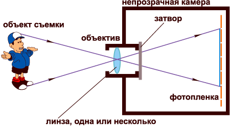 На экране увидим изображение нити накала, а если в комнате достаточно темно, то и саму лампочку и светильник. Можно накинуть на камеру черное покрывало, так как это делают фотографы в фотоателье. Тогда в нашу камеру можно наблюдать любую картинку. Обратите внимание, что изображение перевернуто. То, что мы изготовили, называется камера обскура, она лежит в основе любого фотоаппарата. Настоящий фотоаппарат устроен так же, только в него внесены некоторые технические устройства, облегчающие фотосъемку. Самые первые фотоаппараты были очень похожи на наш макет: деревянный светонепроницаемый ящик, линза в передней стенке и прикрепленная фотопластина на задней стенке. Чувствительность фотоматериалов была очень низкая и поэтому фотограф открывал крышку объектива на продолжительное время, иногда на несколько минут. Чтобы сократить время экспозиции, поджигался заряд магния. Это были первые фотовспышки.