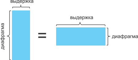 Правильное экспонирование предполагает знание закона взаимозаместимости. Согласно этому закону, для любой пленки с заданной светочувствительностью большая выдержка при малом относительном отверстии эквивалентна малой выдержке при большом относительном отверстии. Схематически этот закон поясняется на рисунке.