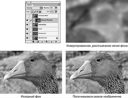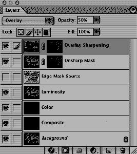 Эта маска ограничивает наложение резкости только краевыми фрагментами изображения. То есть, она не увеличивает количество шума в оставшейся части изображения. Если наложить маску на слои Unsharp Mask и Overlay Sharpening , то результирующий стек слоев должен выглядеть так, как это показано на рис. 4.4.