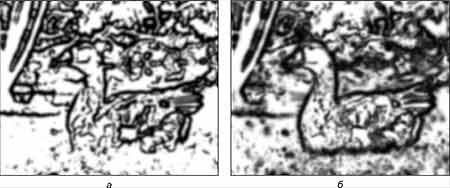 Рис. 4.5. Краевая маска, созданная одновременно из цвета и тона, получается немного неопределенной ( а ). Маска, скомпилированная из отдельных масок для тона и цвета, демонстрирует более четкий результат ( б ), более похожий на объекты изображения