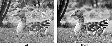 Рис. 4.8. Первоначальное изображение (до) демонстрирует гуся на зашумленном фоне. После того, как будет скорректирована резкость и смазывание, гусь сильнее отличается от фона (после), даже в черных и белых областях