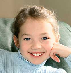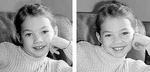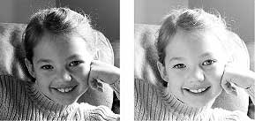Рис. 3.8. Свет из окна предоставляет замечательную основу для домашнего портрета К сожалению, дневного света из окна недостаточно для полного освещения сцены, хотя он и служит основным источником света. Ниже мы обсудим различные возможности дополнительного освещения. Некоторые варианты дают лучший результат по сравнению с остальными, как показано на стр. 8 и 9 цветной вкладки и на рис. 3.9–3.11. Обратите внимание, что все эти изображения были обрезаны таким образом, чтобы в кадре остались только голова и плечи девочки. Изначально получение подобной фотографии невозможно, так как (об этом уже упоминалось в предыдущем разделе) при этом фотоаппарат нужно расположить настолько близко к объекту съемки, что искажения лицевых черт были бы неизбежны. Вспышка Проще всего дополнительно осветить сцену с помощью встроенной вспышки. Как не печально, обычно это приводит к появлению эффекта "красных глаз", в чем можно убедиться на стр. 8 и 9 цветной вкладки. Однако, справедливости ради, следует заметить, что благодаря наличию дневного света из окна зрачки снимаемого объекта будут более сужены, чем в темной комнате, поэтому эффект "красных глаз" окажется слабее. Кроме того, вспышка распространяет узконаправленный свет, в то время как для портретной съемки больше подходит мягкое, рассеянное освещение. Сравните левое и правое изображения на рис. 3.9. Последнее было снято с использованием внешней вспышки, свет от которой отразился от расположенной сзади стены. Второй снимок на стр. 8 цветной вкладки также иллюстрирует результат применения внешней вспышки. Лицо на втором снимке освещено более равномерно, а на цветной версии видно, что эффект "красных глаз" в данном случае полностью устранен. Недостатком такого метода является возникновение большой резкой тени сзади, отвлекающей внимание от объекта. Тень появляется из-за более сильного света внешней вспышки, чем общее освещение.