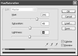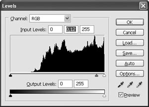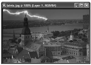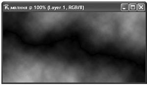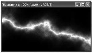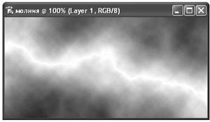 Заданным градиентом заливаем документ так, Применим к градиенту фильтр Filter > Render > Difference Clouds (Фильтр > Рендеринг > Облака с наложением). В результате ровная градиентная заливка исчезнет. Теперь все изображение хаотично размыто и действительно немного напоминает облачное небо перед сильной грозой. В центральной части документа по диагонали располагается более темная часть (почти черная). Вид изображения после действия фильтра Diference Clouds Выполняем команду меню Image > Adjustments > Invert (Изображение > Коррекция > Инверсия) для инвертирования изображения. Так, все, что было черным, станет белым, и наоборот. У нас на темном фоне появится светлая неровная полоса. Новое изображение уже будет напоминать разряд молнии на пасмурном небе. Немного увеличим контрастность полученного изображения, чтобы сильнее выделить след от электрического разряда молнии. В этом нам помогут настройки уровней. Выполняем команду меню Image > Adjustments > Levels (Изображение > Коррекция > Уровни). В диалоговом окне Levels (Уровни) необходимо уменьшить значение средних тонов входных уровней ( Input Levels ). Поэтому серый треугольный ползунок смещаем в правую сторону, ближе к белому ползунку. Такое положение будет соответствовать значению 0,12–0,10. Остальные регулировки уровней можете выполнить по своему усмотрению. Изображение после инвертирования Диалоговое окно Levels (Уровни) В результате изображение должно стать более контрастным. В центре документа по-прежнему будет располагаться неровная белая линия с небольшими светлыми размывами вокруг. Еще раз обращаю внимание, что такие светлые размывы должны быть только вблизи белой ломаной линии. Остальной фон должен быть черным. Согласитесь, что такое изображение уже похоже на реальный электрический разряд молнии. Остается добавить несколько штрихов. Изображение с увеличенной контрастностью Выполняем команду меню Image > Adjustments > Hue/Saturation (Изображение > Коррекция > Цветовой тон/Насыщенность). В диалоговом окне Hue/Saturation (Цветовой тон/Насыщенность) устанавливаем флажок Colorize (Тонирование). Затем, передвигая ползунки, придаем разряду молнии синеватый оттенок. Диалоговое окно Hue/Saturation (Цветовой тон/Насыщенность) Думаю, не имеет смысла приводить черно-белую иллюстрацию итогов нашего раскрашивания. Все, изображение электрического разряда молнии готово. Его можно применять совместно с другими изображениями. Только предварительно надо подготовить такое изображение, ведь молнии не бывает, например, на ясном безоблачном небе. Для этого вы изменяете по необходимости размеры изображения молнии, копируете его в новый слой документа с другим изображением и размещаете в нужном месте. Возможно, вам придется изменить режим наложения слоев. Так, в примере, использован режим наложения слоя с молнией Screen (Осветление). Это привело к уменьшению непрозрачности черного фона изображения с молнией. Пример использования изображения молнии — гроза над Ригой