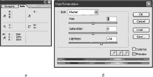 Рис. 8.24. Выравнивание светлоты в цветовых пробах: а — анализ светлоты по палитре информации; Для этого воспользуемся корректирующим слоем. Щелкните в нижней части палитры слоев на значке с наполовину зачерненным кругом, а затем выберите в раскрывшемся меню команду Hue/Saturation ( Тон/Насыщенность ). На экране появится диалоговое окно с элементами управления корректирующим слоем (рис. 8.24, б ). Нам потребуется только нижний из трех ползунков — Lightness ( Светлота ). Перетащите его вправо, наблюдая за изменением значения в поле B палитры информации (после косой черты). Когда значение станет равным 86 % (светлоте корректируемой цветовой пробы), перетаскивание следует прекратить и щелкнуть на кнопке OK . Возвращаем палитру информации в режим отображения цветовой пробы по модели RGB , щелкнув на значке с пипеткой и выбрав в раскрывшемся меню команду RGB Color ( Цветовая модель RGB ). Теперь в палитре отображается формула того цвета, к которому нам придется приводить цветовую пробу корректируемого изображения (рис. 8.25, а ). Ее следует запомнить или, лучше, записать — в нашем примере это RGB (220, 182, 170). Эталонное изображение больше не потребуется, и окно с ним можно закрыть.