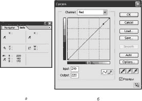 Рис. 8.25. Начало совмещения цвета в цветовой пробе: а — целевая формула цвета, определенная по эталонному изображению с откорректированной светлотой; Приведение цвета цветовой пробы на корректируемом изображении к определенной на предыдущем шаге формуле выполняется с помощью корректирующего слоя Curves ( Кривые ). Создадим его, щелкнув в нижней части палитры слоев на значке с наполовину зачерненным кругом, а затем выбрав в раскрывшемся меню команду Curves ( Кривые ). На экране появится диалоговое окно настройки градационной кривой, представленное на рис. 8.25, б . Коррекцию, как и при глобальной балансировке цвета, придется вести раздельно по всем трем цветовым каналам. Следует убедиться, что из двух кнопок, расположенных под градационной кривой, нажата кнопка с изображением кривой, а не карандаша (в случае необходимости нужно щелкнуть мышью на кнопке с кривой). Далее во всех трех каналах последовательность действий будет одна и та же: