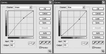 Рис. 8.26. Установка управляющих точек на градационных кривых: а — канала зеленого цвета; б — канала синего цвета Вот, собственно, и все. На рис. 8.27 представлен результат цветовой коррекции исходного изображения.