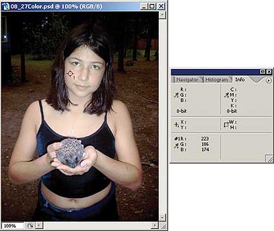 Рис. 8.23. Начальный этап цветовой коррекции совмещением цвета с эталоном: а — установка цветовой пробы на корректируемом изображении; б — установка цветовой пробы на эталоне Выделим фрагменты кожи на этом изображении. Для этого годятся любые инструменты и приемы выделения, подробно описанные в главе 2. Не следует забывать также о необходимости растушевки края выделенной области кистью радиусом 2–4 пиксела — в противном случае на границе могут возникнуть бросающиеся в глаза фрагменты. Чтобы граница выделенной области (марширующие муравьи) не мешала восприятию снимка, скройте ее, нажав клавиши Ctrl + H. Далее на корректируемом изображении следует выбрать опорную точку, изменением цвета которой и будет выполняться совмещение цвета с образцом. Такую точку рекомендуется выбирать в промежуточной зоне между бликами и тенями на коже. Это делается инструментом Color Sampler ( Цветовой пробник ) — его следует выбрать в наборе инструментов и щелкнуть в желаемом месте (см. подраздел "Палитра Info" в главе 1). Затем следует найти и загрузить графический документ с эталонным изображением, на котором имеется желаемый цвет кожи. Для нашего примера таким изображением станет фотография клипарта (рис. 8.23, б ). На эталоне тоже следует установить цветовую пробу, причем вовсе не обязательно она должна располагаться на той же части тела или лица, что в корректируемом изображении. Важен только цвет кожи в выбранной точке. Желательно, чтобы в процессе цветовой коррекции кожи соответствующие фрагменты сохранили ту светлоту, которая была у них в исходном изображении. Для этого светлоту образца следует, не меняя цветов, привести в соответствие со светлотой корректируемого изображения. Вначале определим светлоту в точке цветовой пробы исходного изображения. Для этого достаточно, активизировав окно этого изображения щелчком на его заголовке, в палитре Info ( Информация ) выбрать отображение формулы цвета в соответствии с моделью HSB . Примечание. Последний управляющий параметр цветовой модели HSB не зависит от цвета и определяется только светлотой изображения. Для этого щелкните в палитре информации на пипетке, соответствующей цветовой пробе, и выберите в открывшемся меню команду HSB Color ( Цветовая модель HSB ). На рис. 8.24, а видно, что светлота в точке цветовой пробы составляет 86 %. Проделайте те же действия для определения светлоты в точке цветовой пробы на эталонном изображении. Там она несколько ниже — 79 %. Эталонное изображение следует осветлить.