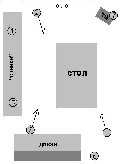 Обратите внимание, на схеме нарисованы точки съемки 1, 2 и 3. Ни одна из них не направлена перпендикулярно бликующим поверхностям. Так из точки 3 недопустимо направлять фотоаппарат прямо в точку 7, т.к. вспышка обязательно отразится в телевизоре. Все эти проблемы исчезнут, если вы повернете вспышку в потолок.